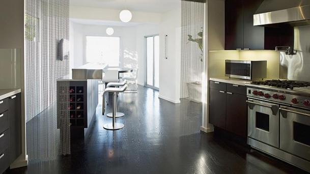 This apartment with nice shades of blue and a beautiful bathroom will help you to relax after work.